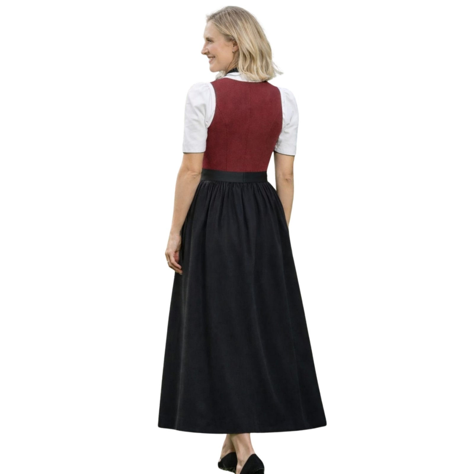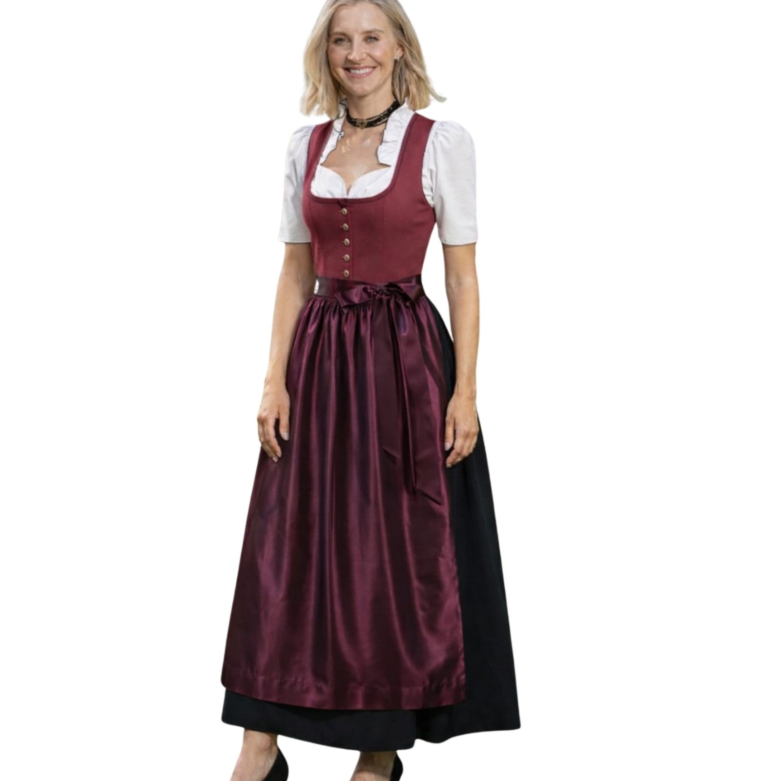 Wine Red Black Long Dirndl Dress comes as a full set including the wine red bodice dress, a white short-sleeve puff blouse with ruffled neckline, and the coordinating wine satin apron with bow tie. Every piece is thoughtfully designed to work together as a cohesive, festival-ready outfit straight from the heart of Bavaria.